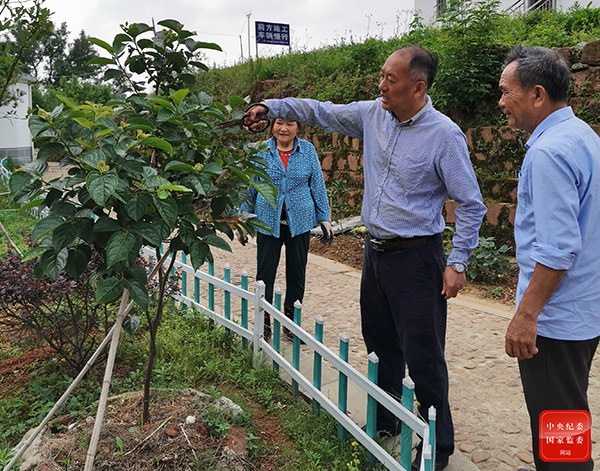 圖為江西省紀(jì)委監(jiān)委駐村工作隊(duì)員正在與村民交流果樹(shù)種植技術(shù)。
