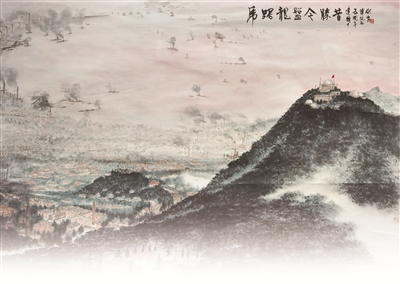 1949年4月23日,人民解放軍占領(lǐng)南京。毛澤東聞?dòng)嵑螅廊粚懴逻@首詩(shī),描寫了人民解放軍橫渡長(zhǎng)江、解放南京的雄偉壯闊、氣勢(shì)磅礴場(chǎng)面。在畫作中,畫家描繪的是南京城的壯麗景色,沐浴在朝暉之中的紫金山及其周圍景致,以浪漫的詩(shī)意呈現(xiàn)出來(lái)。近處,紫金山巍峨高聳,天文臺(tái)亦清晰可見;中景,江上輪渡往來(lái),兩岸工廠林立,煙霧繚繞;遠(yuǎn)處,紅霞爛漫,水天一色。新中國(guó)成立后的南京繁忙而祥和,墨色淋漓間,新中國(guó)欣欣向榮的景象躍然紙上。