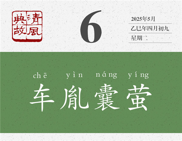 《晉書(shū)•車胤傳》:“太守王胡之名知人,見(jiàn)胤于童幼之中,謂胤父曰:‘此兒當(dāng)大興卿門(mén),可使專學(xué)。’胤恭勤不倦,博學(xué)多通。家貧不常得油,夏夜則練囊盛數(shù)十螢火以照書(shū),以夜繼日焉。”意思是,當(dāng)時(shí)的南平太守叫王胡之,以善于識(shí)別人才而聞名,他在一群孩子中看到車胤以后,就對(duì)車胤的父親說(shuō):“這孩子將來(lái)能擔(dān)任大官,應(yīng)該讓他讀書(shū)深造。”從此以后,車胤認(rèn)真勤勉,學(xué)而不倦,博覽群書(shū),精通學(xué)問(wèn)。車胤家里貧窮,買不起燈油,夏天抓幾十只螢火蟲(chóng),放入白絹袋子中,利用它來(lái)照明,夜以繼日苦讀不輟。