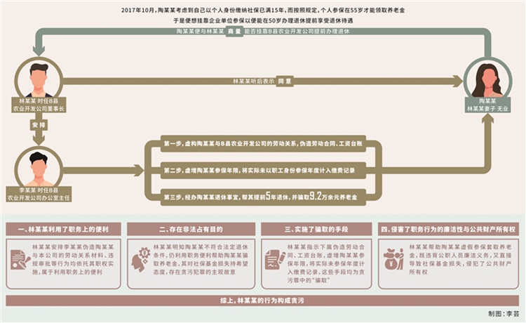 貪污罪。2017年10月,林某某妻子陶某某(無業(yè),另案處理)考慮到自己以個人身份繳納社保已滿15年,而按照規(guī)定,個人參保在55歲才能領取養(yǎng)老金,于是便想掛靠企業(yè)單位參保,以便能在50歲辦理退休、提前享受退休待遇?;诖?,陶某某便與林某某商量能否掛靠B縣農業(yè)開發(fā)公司提前辦理退休,林某某聽后表示同意,并利用擔任該公司董事長的職務便利,在明知陶某某不符合提前退休條件的情況下,安排時任公司辦公室主任李某某(另案處理)虛構勞動關系,為陶某某以該公司職工身份辦理退休事宜。手續(xù)辦理過程中,李某某按林某某的安排,偽造B縣農業(yè)開發(fā)公司與陶某某的《勞動合同書》,經(jīng)林某某本人簽字后加蓋公司合同專用章,陶某某憑該合同在B縣人力資源和社會保障局進行勞動合同鑒證。完成鑒證后,陶某某順利以B縣農業(yè)開發(fā)公司職工身份參保,當年度公司為其繳納職工養(yǎng)老保險、工傷保險、失業(yè)保險、醫(yī)療保險共計7649.76元。其間,陶某某從未在B縣農業(yè)開發(fā)公司上班,也未向公司補繳為其繳納的社保費用。