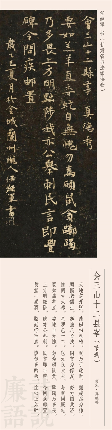 公元1232年,南宋官員真德秀到福州擔(dān)任知府,到任后把下轄12個縣的知縣召集在一起集體談話,擺事實、講道理,談廉政、申紀律,事后將談話內(nèi)容寫成了詩,就是今天我們看到的這首作品。這是一首五言敘事詩,長達250字,這里我們節(jié)選后半部分。
