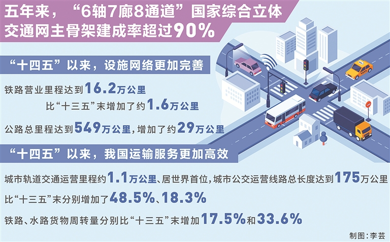 “人員貨物的高效流動彰顯了中國繁榮發(fā)展的活力。在過去一年中,平均每天約有1.8億人次跨區(qū)域出行、每天運送1.6億噸貨物、每天攬收4.78億件快遞。”劉偉說,“十四五”以來,我國運輸服務更加高效,軌道交通、常規(guī)公交、慢行交通網絡融合發(fā)展,城市軌道交通運營里程約1.1萬公里、居世界首位,城市公交運營線路總長度達到175萬公里,比“十三五”末分別增加了48.5%、18.3%。鐵路、水路貨物周轉量分別比“十三五”末增加17.5%和33.6%,港口集裝箱鐵水聯(lián)運量年均增速約15%。去年,全社會物流成本節(jié)約超過4000億元,其中交通運輸成本降低了約2800億元。