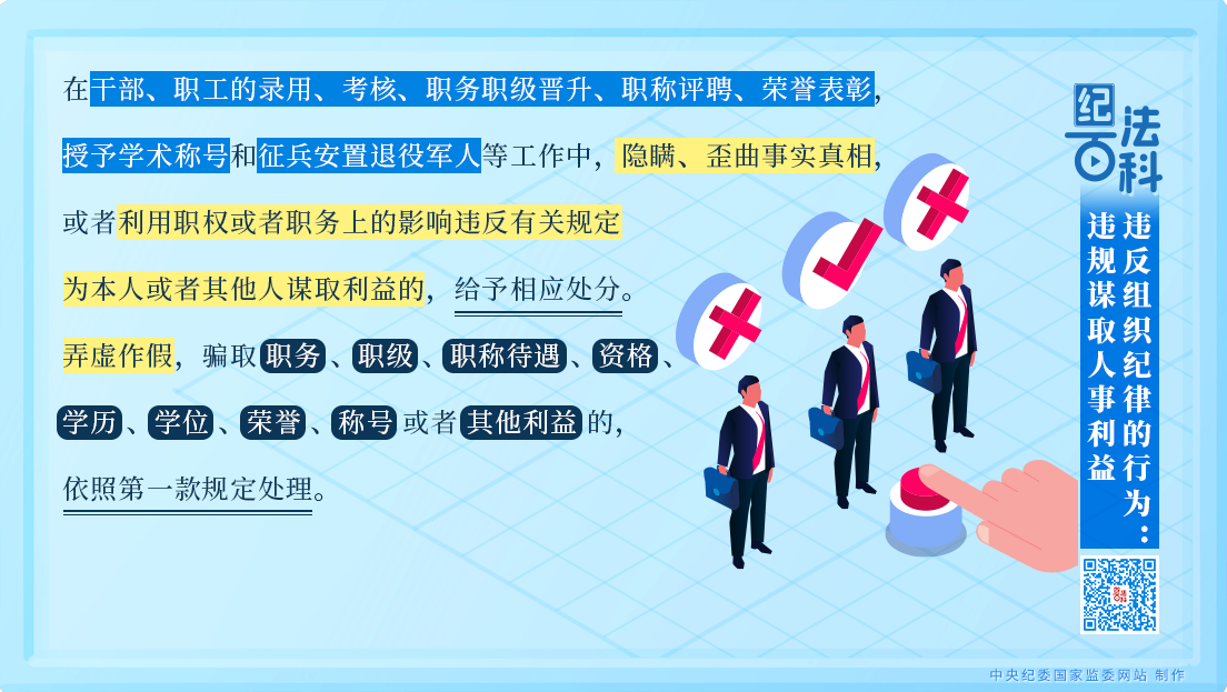 第一款規(guī)定,在干部、職工的錄用、考核、職務(wù)職級晉升、職稱評聘、榮譽表彰,授予學(xué)術(shù)稱號和征兵安置退役軍人等工作中,隱瞞、歪曲事實真相,或者利用職權(quán)或者職務(wù)上的影響違反有關(guān)規(guī)定為本人或者其他人謀取利益的,給予相應(yīng)處分。