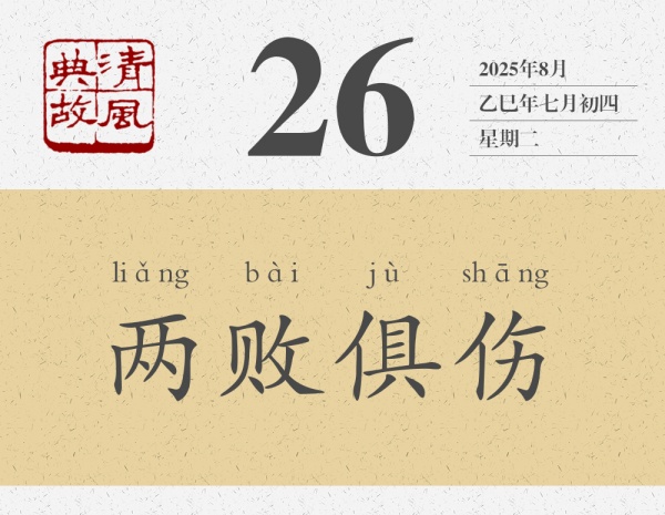 講完這個(gè)故事,陳軫言歸正傳,對(duì)秦惠王說:“今韓魏相攻,期年不解,是必大國傷,小國亡,從傷而伐之,一舉必有兩實(shí)。此猶莊子刺虎之類也。”秦惠王聽從了陳軫的建議,后來“大國果傷,小國亡,秦興兵而伐,大克之”。后世即以“兩敗俱傷”為典,比喻爭(zhēng)斗雙方都會(huì)受到損失,誰也得不到好處,也用來形容毫無意義的爭(zhēng)斗?!缎挛宕?bull;宦者傳論》:“雖有圣智,不能與謀。謀之而不可為,為之而不可成。至其甚,則俱傷而兩敗。”