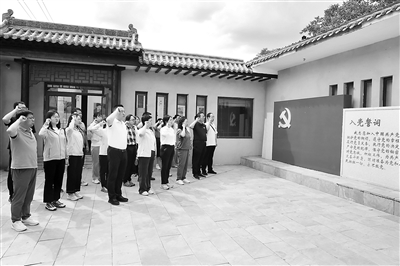 近日,山西省紀(jì)委監(jiān)委機(jī)關(guān)部分黨員在晉綏八分區(qū)(專署)舊址開(kāi)展“傳承紅色基因,砥礪初心使命”主題黨日活動(dòng)。圖為黨員重溫入黨誓詞。王鵬波 攝