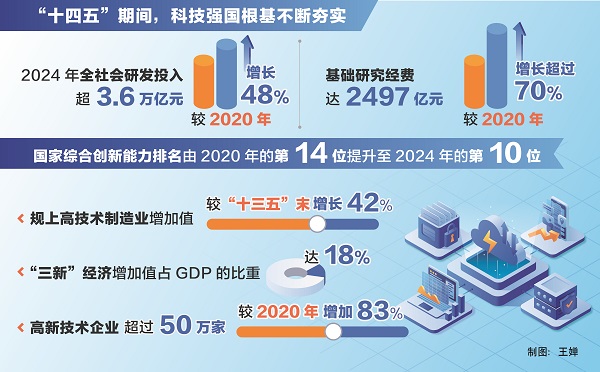 “這五年,科技創(chuàng)新能力穩(wěn)步提升,科技強國根基不斷夯實。”陰和俊說,我國科技投入持續(xù)增加,2024年全社會研發(fā)投入超3.6萬億元,較2020年增長48%;基礎研究經(jīng)費達2497億元,較2020年增長超過70%,在量子科技、生命科學、物質(zhì)科學、空間科學等領域取得一批重大原創(chuàng)性成果;國家實驗室體系建設穩(wěn)步推進,國家科研機構(gòu)、高水平研究型大學科研能力不斷提升,科技領軍企業(yè)加快培育成長;北京、上海、粵港澳大灣區(qū)國際科創(chuàng)中心支撐引領和輻射帶動作用不斷增強,深圳-香港-廣州躍居全球百強創(chuàng)新集群榜首;國家綜合創(chuàng)新能力排名由2020年的第14位提升至2024年的第10位。
