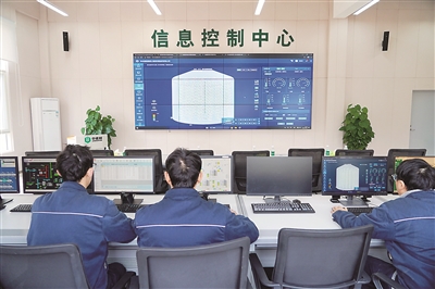 圖①:在中儲(chǔ)糧四川新津直屬庫(kù)信息控制中心,倉(cāng)儲(chǔ)保管員通過在線監(jiān)控系統(tǒng)查看倉(cāng)儲(chǔ)作業(yè)情況。