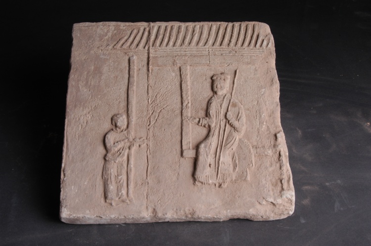 宋代。縱30.2厘米,橫30.7厘米,厚3厘米。征集。磚呈長(zhǎng)方形,青灰色,通過模印工藝展示了屋檐下一婦人坐于窗臺(tái)前,給一端物的幼子訓(xùn)話的場(chǎng)景,是研究宋代社會(huì)生活、家庭倫理及畫像磚藝術(shù)的珍貴實(shí)物資料。