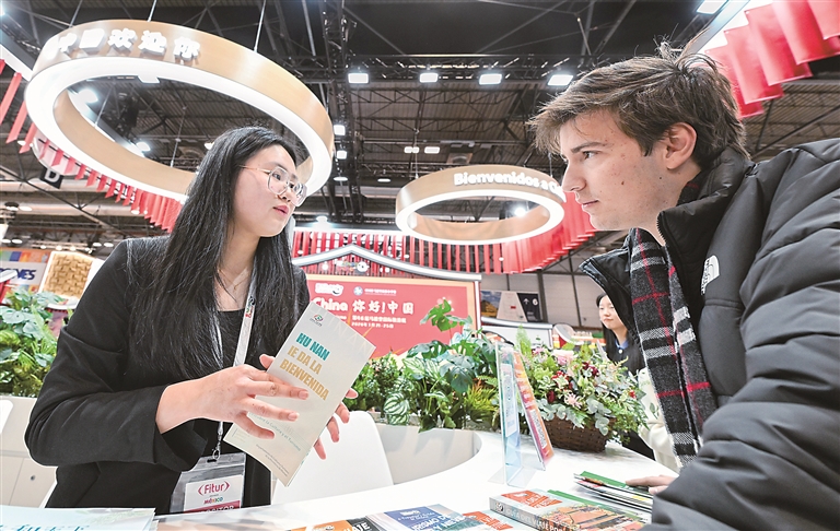 近年來,過境免簽政策持續(xù)擴(kuò)容、免稅購物政策不斷優(yōu)化、“即買即退”適用商店持續(xù)增加……得益于中國日益開放的舉措,越來越多外國游客在中國旅游、購物,感受更加開放包容、多元?jiǎng)?chuàng)新的中國。圖為1月21日至25日舉行的馬德里國際旅游展上,參觀者在中國展臺(tái)咨詢。新華社記者 程敏 攝