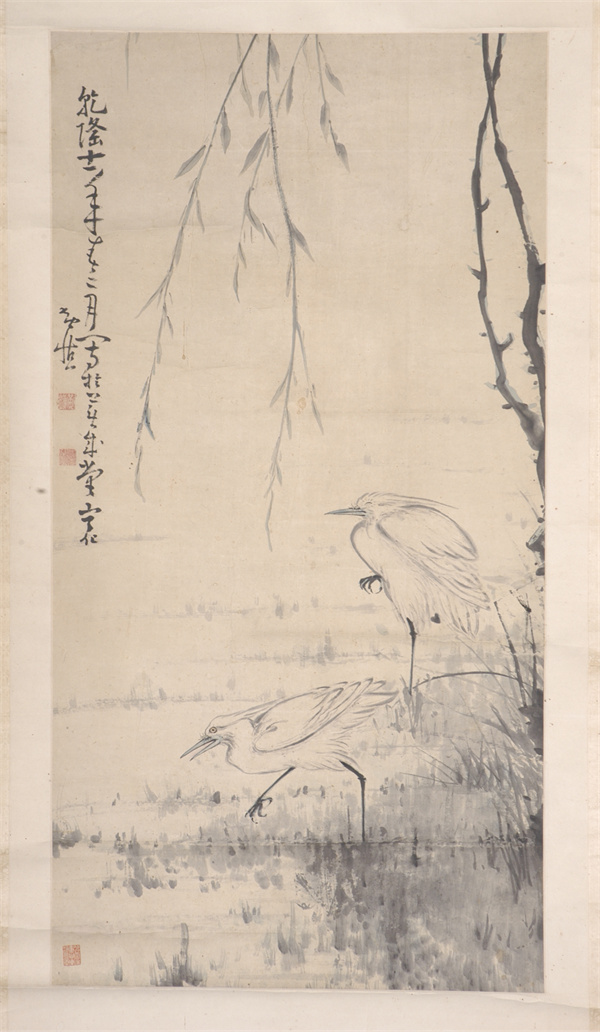 清代,水墨設(shè)色花鳥(niǎo)畫立軸,紙本,作者黃慎??v高1126厘米,橫寬57.4厘米。款署“乾隆十一年春二月寫于蕪成堂寧化黃慎”。鈐“黃慎”白文方印,“癭瓢”白文方印。柳枝自畫面上方垂下,疏落的柳葉隨風(fēng)搖曳。池塘兩只白鷺,一只閉目獨(dú)立,一只行走覓食。黃慎,福建寧化人,書畫家,為“揚(yáng)州八怪”之一。