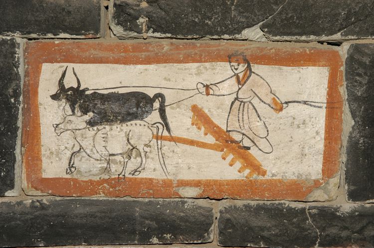 魏晉時(shí)期,嘉峪關(guān)市新城魏晉5號(hào)墓出土。長35.5厘米,寬17厘米。磚呈長方形,白粉涂底,土紅色勾勒邊框,墨線描繪,紅、黑色敷彩。畫面繪一男子身著紅領(lǐng)右衽長袍,左手持鞭,右手持繩,站于二牛抬杠耙上耙地。黑?;厥追搭?,白牛用力前行,共拉紅色齒耙。