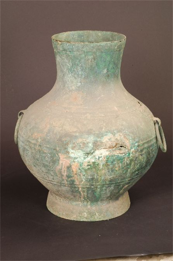 漢代,武威雷臺漢墓出土。高44.2厘米,口徑18.1厘米,底徑21.9厘米。直口,圓腹,假圈足,腹部有三組瓦紋和對稱的兩個(gè)獸面銜環(huán)輔首,腹上部篆書“巨李鍾”三字。李,姓氏?!墩f文•金部》:“鐘,酒器也。從金,重聲。”