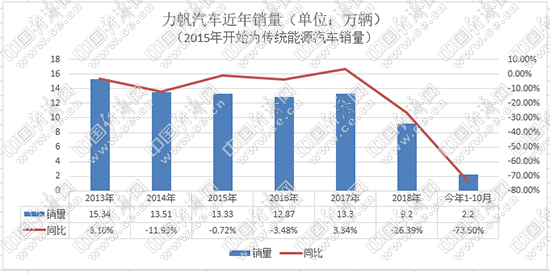 2006年,力帆推出首款轎車力帆520,新車不足5萬元的售價在當(dāng)時引發(fā)關(guān)注,月銷量一度達(dá)到5000輛。2013年,力帆年銷售汽車15.34萬輛,成為汽車界的一匹黑馬。然而,好景不長。自2016年開始,力帆汽車進(jìn)入下行趨勢,目前更是步履維艱。力帆產(chǎn)銷快報顯示,2019年1-10月,力帆傳統(tǒng)乘用車?yán)塾嬩N售2.2萬輛,同比下滑73.5%,10月僅銷售29輛;新能源累計銷售2458輛,同比下降65.42%,10月僅銷售423輛。