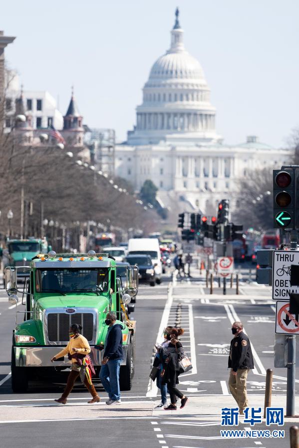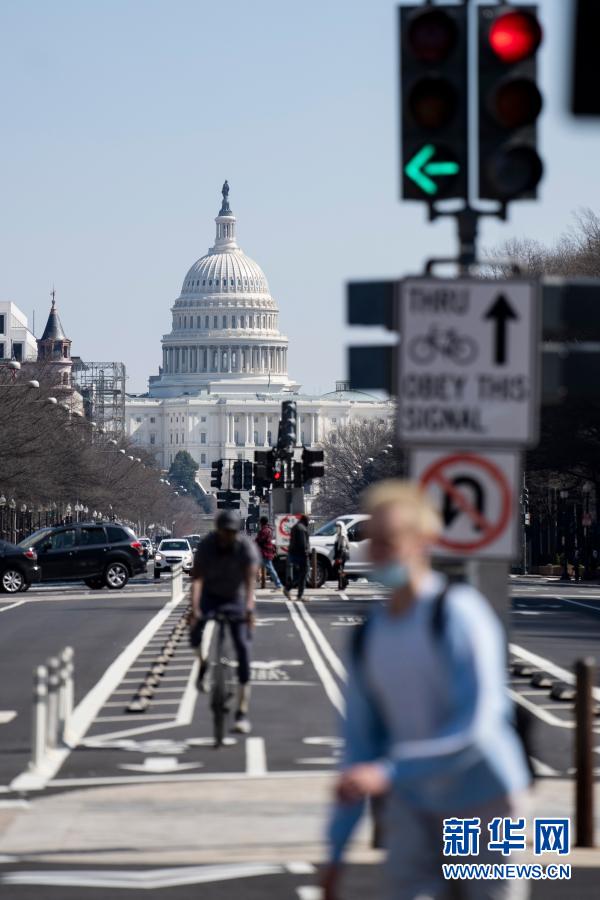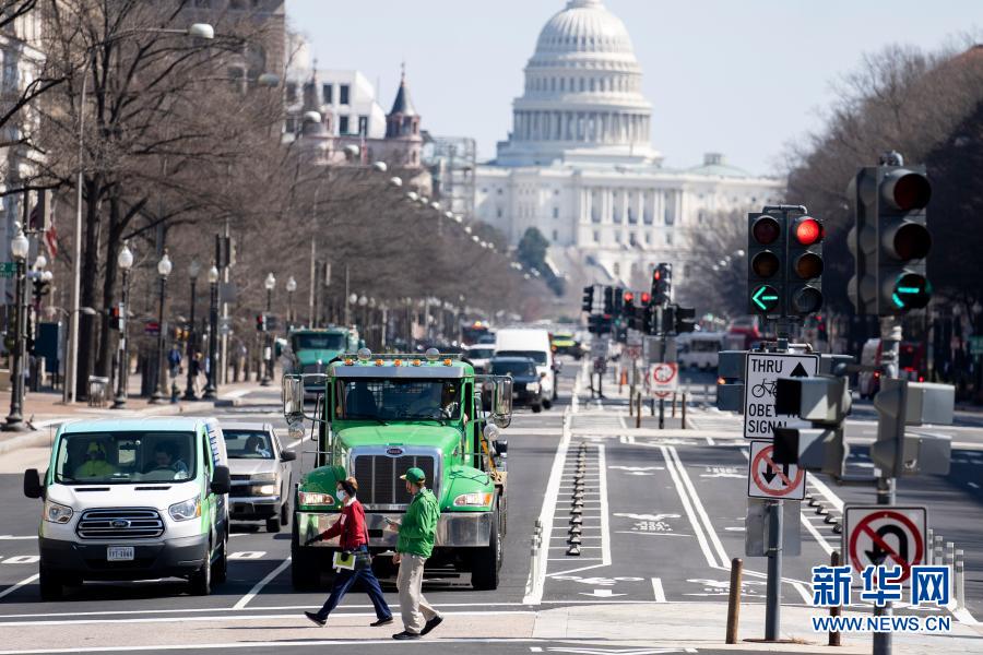3月10日,在美國(guó)首都華盛頓,人們經(jīng)過(guò)國(guó)會(huì)大廈附近的一處路口。新華社記者劉杰攝