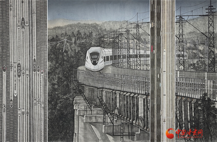 由甘肅畫院青年畫院劉峰至創(chuàng)作的國(guó)畫《中國(guó)高鐵進(jìn)大山》