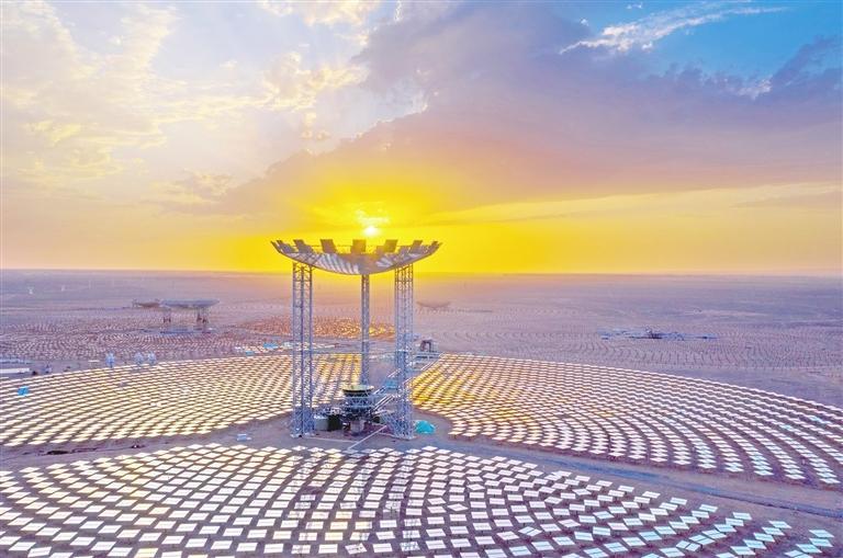一排排風(fēng)電機(jī)組整齊列陣迎風(fēng)旋轉(zhuǎn),蔚然壯觀;成片的光伏板將茫茫戈壁裝點(diǎn)成浩瀚的藍(lán)色海洋,熠熠生輝;上萬(wàn)塊定日鏡和吸熱塔構(gòu)成超級(jí)鏡子發(fā)電站,耀眼且震撼。