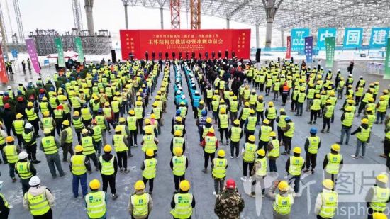 2月18日,蘭州中川國際機場三期擴建工程航站樓工程主體結(jié)構(gòu)合攏活動暨沖刺動員會在甘肅蘭州新區(qū)舉行。圖為活動現(xiàn)場。 中新社記者 九美旦增 攝