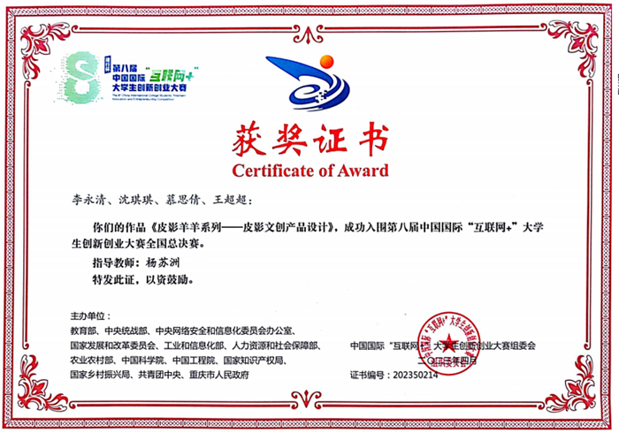 中國甘肅網7月12日訊(西北角·中國甘肅網記者 余守萱 通訊員 郭海霞)近日,從中國國際“互聯網+”大學生創(chuàng)新創(chuàng)業(yè)大賽組委會傳出喜訊,由環(huán)縣第二中學楊蘇洲老師指導,學生李永清、沈琪琪、慕思倩、王超超四人共同創(chuàng)作完成的作品《皮影羊羊系列——皮影文創(chuàng)產品設計》,成功入圍第八屆中國國際“互聯網+”大學生創(chuàng)新創(chuàng)業(yè)大賽全國總決賽。