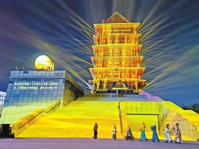 在黃河樓景區(qū),平時只有周末觀演的“黃河頌·大有蘭州”多媒體實景演出開啟了為期一個月的常態(tài)化巡演,每晚9時,璀璨的光影映襯著巍峨雄壯的黃河樓,在3D Mapping多媒體技術的加持下,帶給游客難忘的光影夜游體驗。而近日黃河樓入園游客較平時也增長了3倍之多,登樓參觀人數(shù)日均達到3000人次。