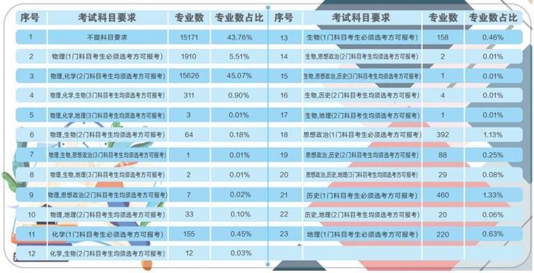 據(jù)了解,根據(jù)《甘肅省深化高等學??荚囌猩C合改革實施方案》要求,從 2021年秋季入學的普通高中一年級學生開始,實行基于統(tǒng)一高考和高中學業(yè)水平考試成績、參考綜合素質(zhì)評價的高??荚囌猩J健5?024年,基本形成分類考試、綜合評價、多元錄取的高??荚囌猩贫龋∪龠M公平、科學選才、監(jiān)督有力的高??荚囌猩w制機制。此次在我省報送選考科目要求的高校專業(yè)共計64092條,其中本科專業(yè)34670條。專業(yè)選考科目要求共有23種組合,其中不提科目要求的本科專業(yè)數(shù)量占本科專業(yè)總數(shù)的43.76%,含物理科目的占比為51.79%,含化學科目的占比為46.46%,含歷史科目的占比為1.74%,含“物理+化學”科目的占比為45.98%。