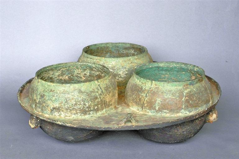 1979年,靈臺縣獨店鎮(zhèn)中慶村飲馬嘴漢墓出土了一件類似火鍋的連體三釜銅灶。通高16.4厘米,釜口徑分別為17厘米、17.4厘米、16.7厘米。三連釜,用九塊范鑄成。三釜均斂口,圓唇,球腹,圜底。圓盤窄沿,盤面近沿處分別置三個三角形掛鈕,盤下三釜外側各有一支釘,釜底有煙炱。從盤面間三系看,可供吊掛,盤陰三個支臺,可用于支撐,顯然有流動使用的功能。三個釜可同時烹煮不同食物,圓盤還可烘烤其他食品。老百姓俗稱三釜銅“火鍋”,但該銅灶是否為火鍋還需要進一步考證。