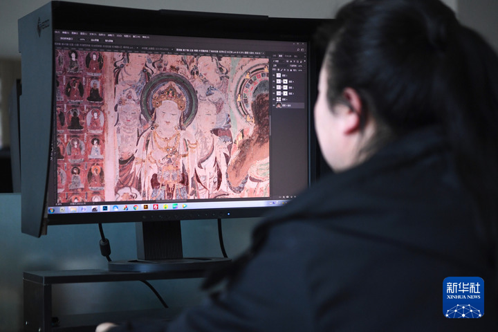 4月25日,敦煌研究院文物數(shù)字化保護(hù)團(tuán)隊(duì)圖像處理人員年海麗在拼接壁畫(huà)圖像。新華每日電訊記者 陳斌 攝