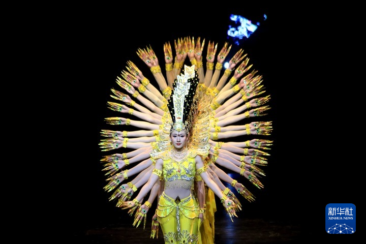 9月10日晚,在甘肅敦煌大劇院,演員在大型情景音畫(huà)劇《千手千眼》中表演。新華社發(fā)(張曉亮 攝)