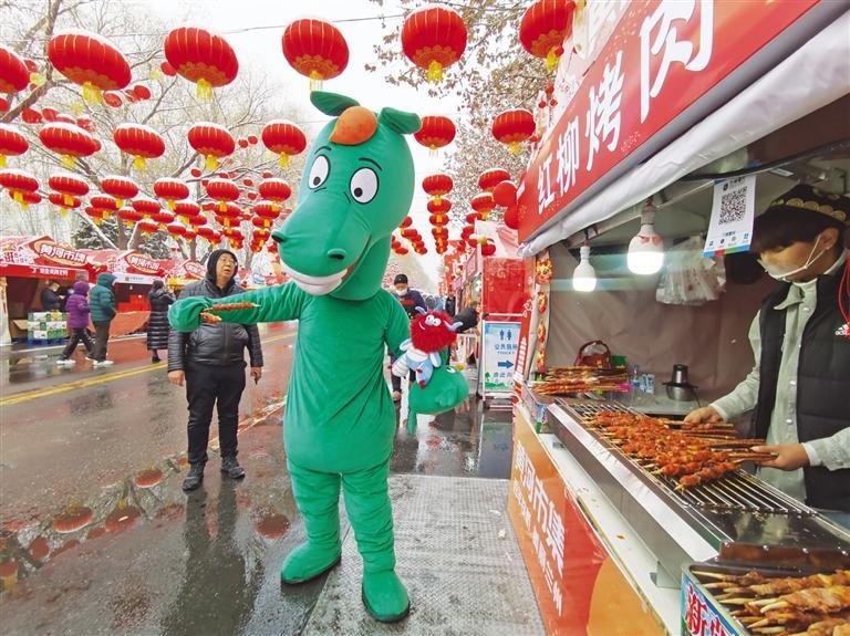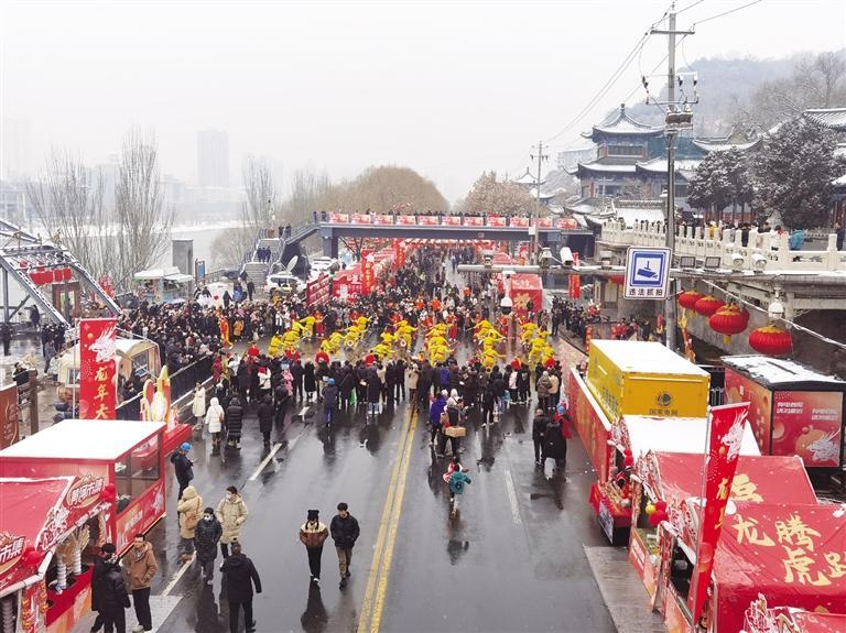 中國甘肅網2月3日訊 據蘭州晚報報道 2月2日北方小年當天,黃河市集在北濱河路白塔山公園門前熱鬧開市?,F(xiàn)場,大紅燈籠高高懸掛、福字帳篷年味滿滿,紅柳烤肉、冰糖雪梨、糖葫蘆、糖畫、牛奶雞蛋醪糟、丁娃燒餅等特色小吃攪動著市民游客的味蕾;民間手藝人制作的非遺手工藝品、洮硯、傳統(tǒng)絨花做工精巧,吸引了許多人駐足欣賞;太平鼓、舞獅等表演在市場上掀起了高潮,許多市民游客上前摸摸獅子討個好彩頭,在小年這天沉浸式體驗了新春市集里的幸福煙火氣息。
