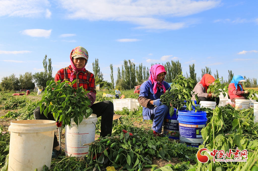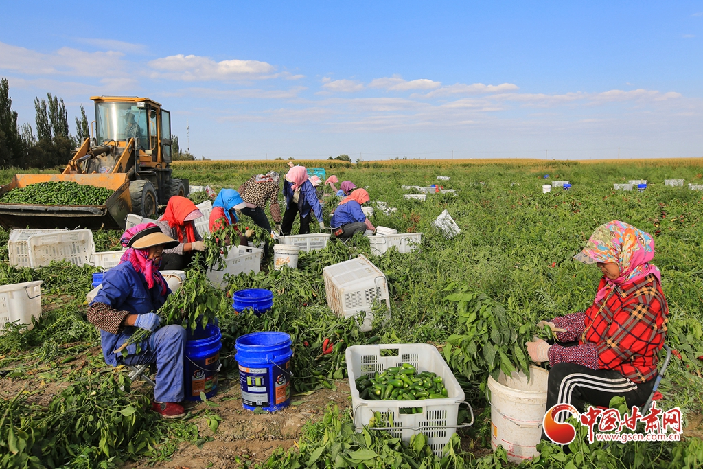 9月1日,嘉峪關(guān)市新城鎮(zhèn)長城村一農(nóng)民專業(yè)合作社種植的子彈頭辣椒喜獲豐收,種植戶搶抓農(nóng)時(shí)采摘,農(nóng)用機(jī)械車輛穿梭于田間地頭,鄉(xiāng)村田野呈現(xiàn)出一派繁忙的景象。