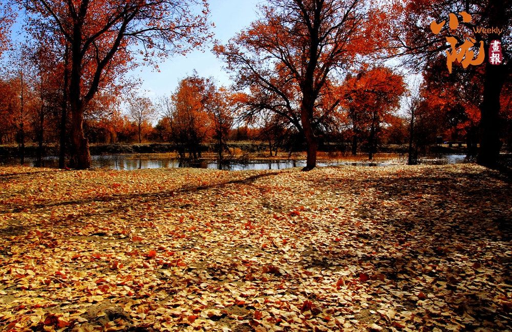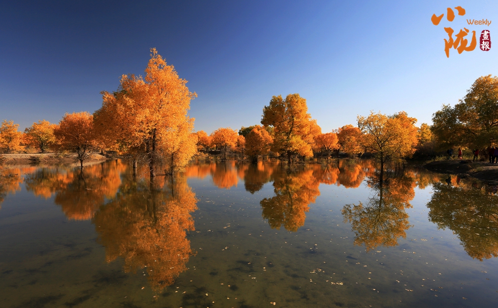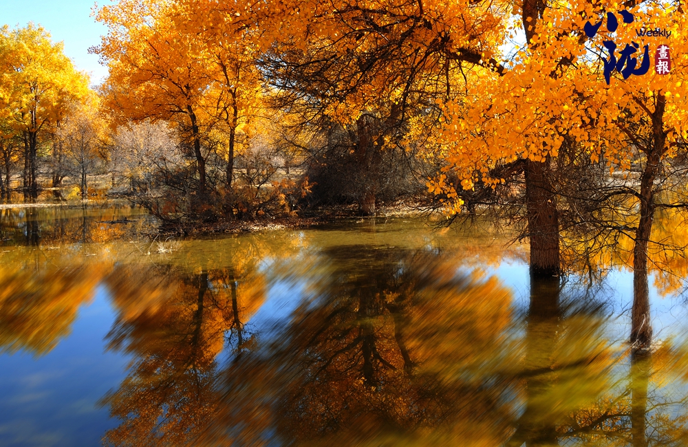 湛藍(lán)的天空、清澈的湖水、倒影的胡楊、金色的落葉,斑斕得如同油畫色彩。