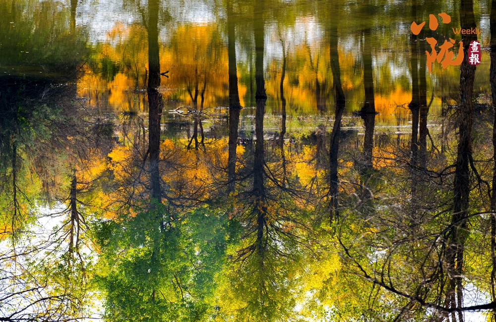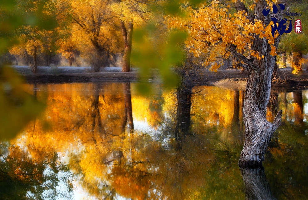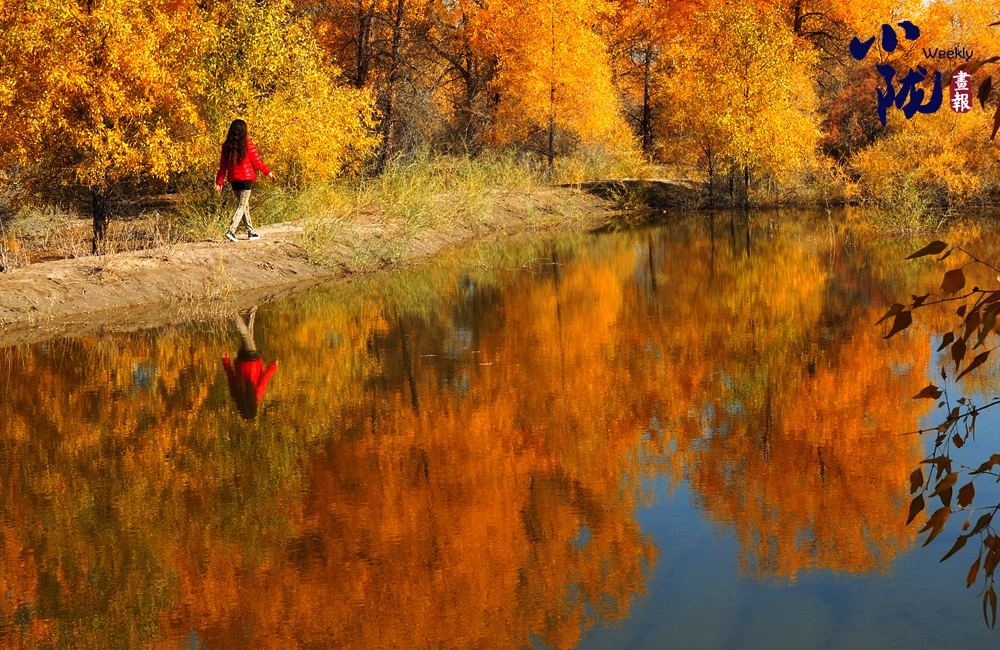 那清澈的金波湖面倒映著胡楊高大的身影,多姿的樹干,黃色的樹葉,都毫不保留地在水中展示出來。
