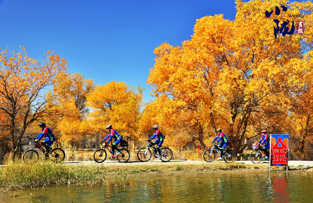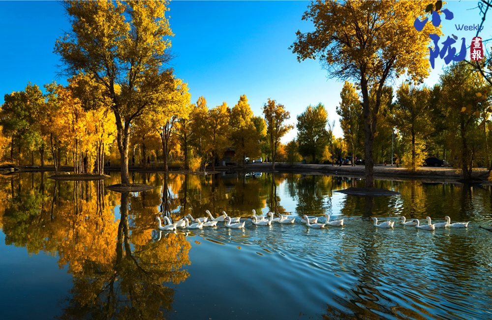 金色的胡楊倒映在蔚藍(lán)的水中,白鵝嬉戲,構(gòu)成了一幅幅色彩對(duì)比強(qiáng)烈、視覺沖擊力極強(qiáng)的絕美畫面。