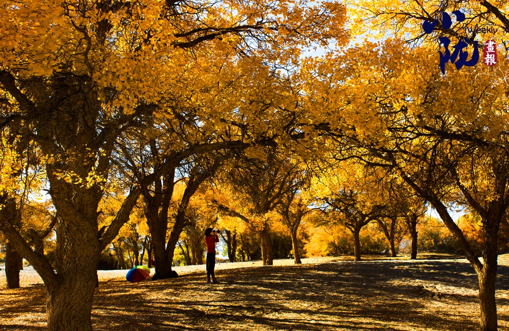 一排排胡楊高大挺拔、蔥蔥蘢蘢,一棵棵樹冠如同一把把巨傘,遮天蔽日、枝繁葉茂,絢爛得仿佛一片金色的海洋。