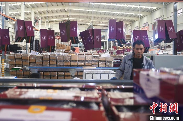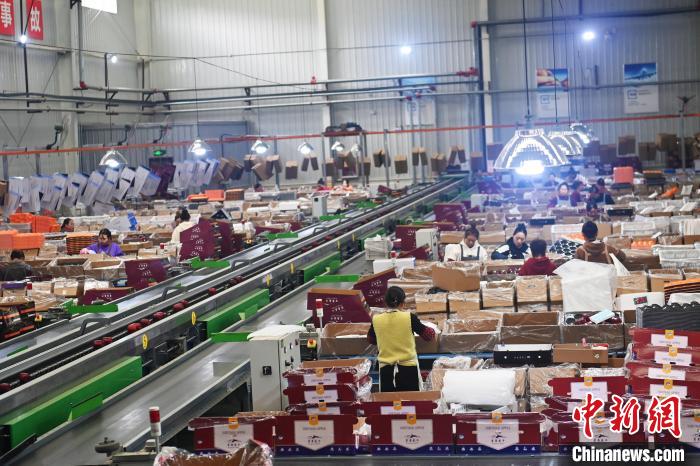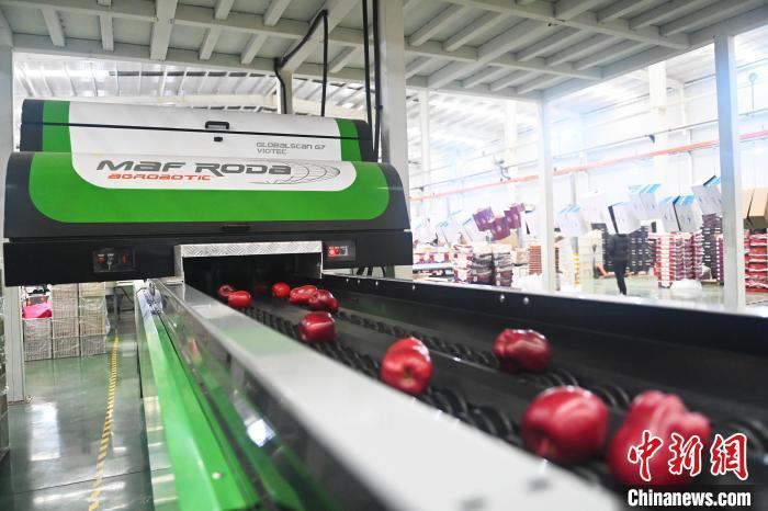 10月21日,在甘肅省天水市秦安縣雪原果品有限公司加工車間,蘋果自動(dòng)化分揀線正在運(yùn)行。中新社記者李亞龍攝