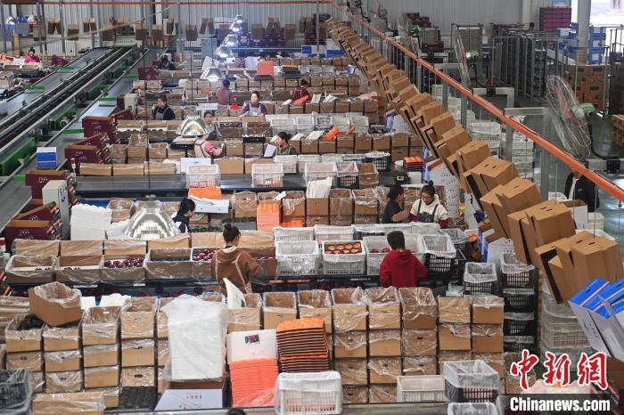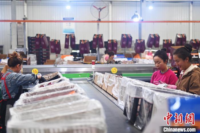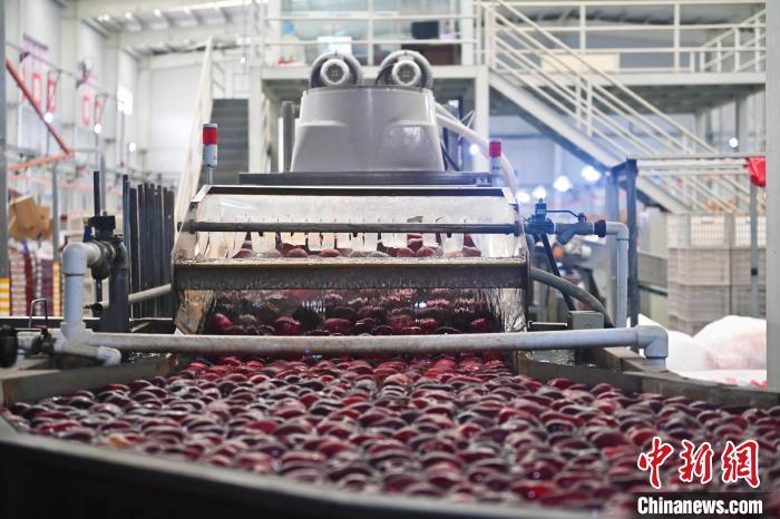 10月21日,在甘肅省天水市秦安縣雪原果品有限公司加工車間,蘋果自動(dòng)化分揀線上工作人員進(jìn)行分揀工作。該生產(chǎn)線每天能處理30噸蘋果,蘋果經(jīng)過設(shè)備水洗、烘干、稱重等環(huán)節(jié),進(jìn)入不同等次的包裝線,工人們?cè)賹?duì)每顆蘋果進(jìn)行復(fù)檢、貼標(biāo),分裝在不同規(guī)格的包裝箱中。甘肅秦安蘋果總面積61.37萬畝,產(chǎn)量86.8萬噸,產(chǎn)值55.6億元人民幣,先后從國內(nèi)科研院所引進(jìn)青砧、M26、ZH5等抗重茬蘋果矮化砧木6個(gè),配合國家蘋果產(chǎn)業(yè)技術(shù)體系,引進(jìn)長(zhǎng)富2號(hào)、煙富6號(hào)、煙富8號(hào)、瑞香紅等蘋果新品種12個(gè)。中新社記者李亞龍攝