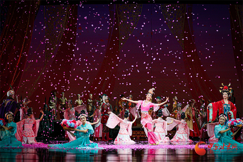 當(dāng)全息投影將莫高窟壁畫在舞臺(tái)上緩緩展開,當(dāng)駝鈴聲與電子樂編曲交織出跨越時(shí)空的和弦,觀眾相信,所謂“傳統(tǒng)”從不是凝固的標(biāo)本,而是流動(dòng)的生命,正如劇中穿越千年的花雨,落在古代畫工的筆端,落在當(dāng)代舞者的袖間,浸潤(rùn)海內(nèi)外每一位觀演者的心田。劇中描繪的中外友好通商、民心交融場(chǎng)景,更是對(duì)新時(shí)代“一帶一路”倡議的生動(dòng)詮釋。(甘肅省文化旅游廳供圖)