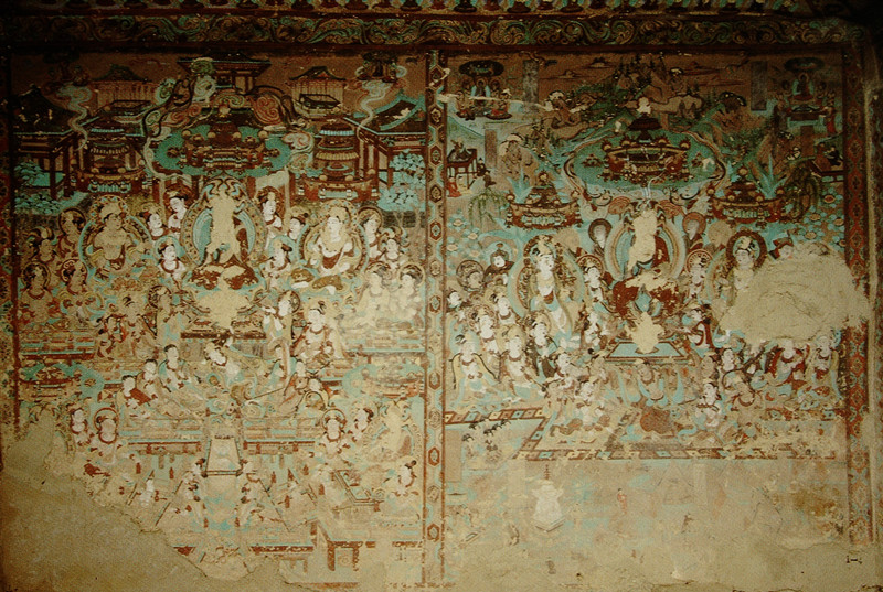 畫面中的人物造型嚴(yán)格遵循唐代仕女的畫風(fēng)繪制,顯得豐腴飽滿,恰似盛唐時期雍容華貴的氣質(zhì)寫照。線描寫實(shí)明快,流暢飛動,一氣呵成,仿佛是畫師用靈動的筆觸在墻壁上勾勒出的生命樂章。畫面的顏色以石綠、赭黃、鉛白為主色。整個畫面顯得典雅、嫵媚,令人賞心悅目。雖然伎樂天頭部原本貼金的頭飾已經(jīng)剝落,但歲月的痕跡并未減損她雍容華貴的氣質(zhì),反而更增添了一份歷史的厚重感。
