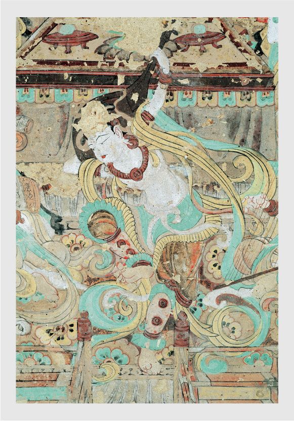 為了生動地表現(xiàn)出舞樂的真實(shí)感,畫師巧妙地采用了透視的技法。通過這種透視技法,觀者仿佛置身于真實(shí)的演出現(xiàn)場,能夠真切地感受到伎樂天伴著仙樂翩翩起舞的美妙場景。她修長的飄帶也隨著舞姿而扭動起來,仿佛有了生命一般。一千年之后,畫面被定格在了那一刻,成為了永恒的經(jīng)典。