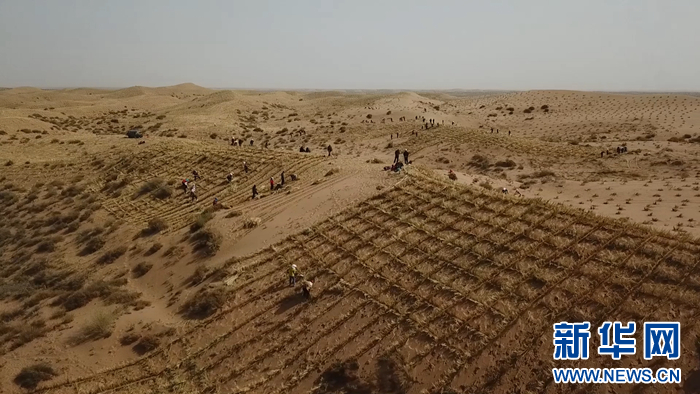 圖為甘肅省武威市古浪縣八步沙林場(chǎng)在扎草方格壓沙(資料圖片)。新華網(wǎng)發(fā)(童張偉 攝)