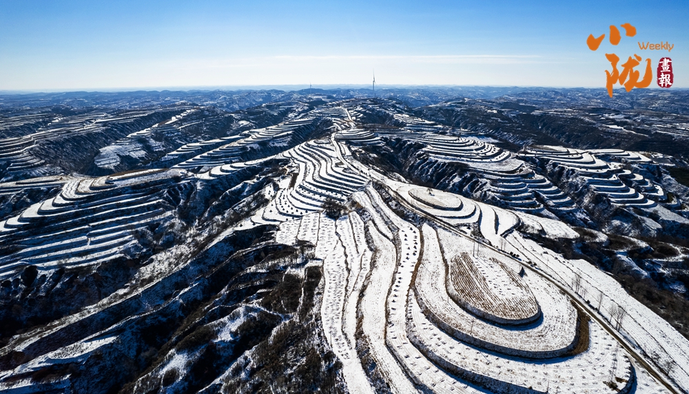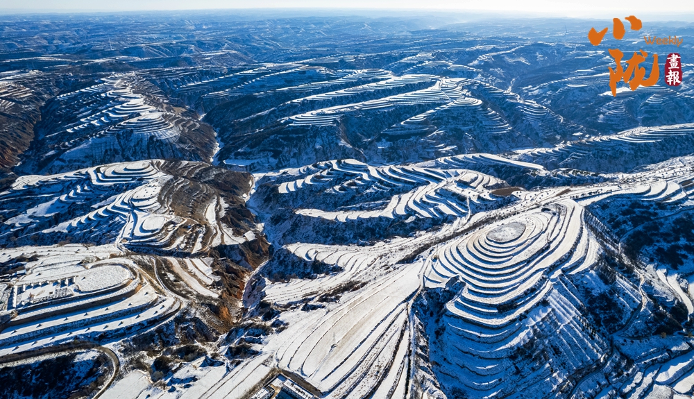 俯瞰雪后華池,溝壑縱橫的黃土高原披上銀裝,陽光斜照雪野之上,投下深淺交錯的光影,靜謐中流轉著溫柔的明暗,純凈而遼遠。