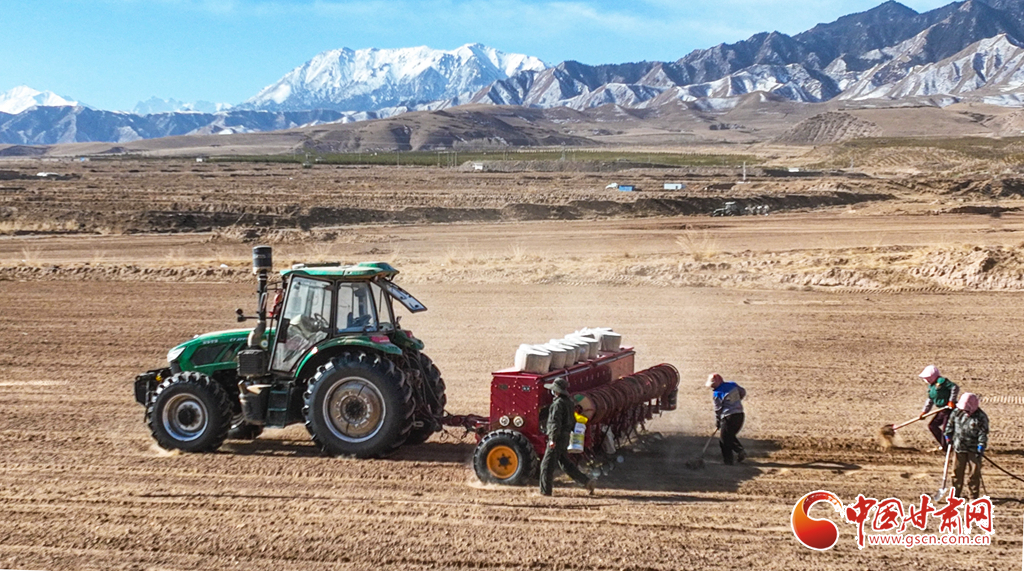 4月1日,位于祁連山下的張掖市甘州區(qū)花寨鄉(xiāng)金花寨種植專業(yè)合作社小麥種植基地里,農(nóng)戶利用北斗導(dǎo)航自動(dòng)駕駛拖拉機(jī),牽引集播種、施肥、覆膜、滴灌帶鋪設(shè)于一體的播種機(jī)械,開(kāi)展淺埋滴灌小麥播種。
