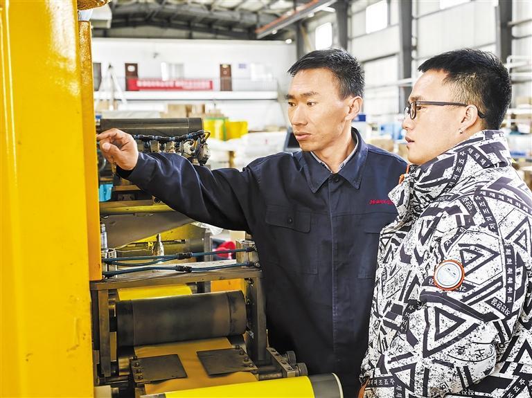 科技專員劉生壽(左)與甘肅盈騰節(jié)能科技有限公司技術(shù)負(fù)責(zé)人趙文強(qiáng)在討論工作。本版圖片攝影:新甘肅·甘肅日報記者 吳涵