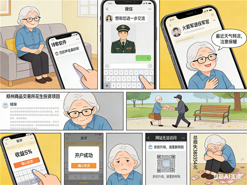 警方拆解該案騙術(shù)發(fā)現(xiàn),騙子共分七步將紀(jì)奶奶從“詩友”變成“提款機(jī)”。第一步,潛入詩歌朗誦這類中老年人聚集的興趣社群,精準(zhǔn)篩選目標(biāo);第二步,以“聲音好聽”為切入點(diǎn),通過情感鋪墊營造“黃昏戀”錯覺,建立情感依賴;第三步,多次切換聊天軟件,躲避平臺反詐監(jiān)測;第四步,偽裝“火箭軍”身份,利用老一輩對軍人的天然信任感,以國家信譽(yù)背書;第五步,讓老人幫忙操作虛假賬戶,親眼見證“穩(wěn)賺5%”的假象;第六步,邀請老人自己投資,誘導(dǎo)其向個人銀行卡轉(zhuǎn)賬;第七步,要求線下現(xiàn)金交易,繞過銀行風(fēng)控,增加資金追回難度。