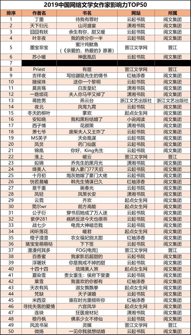中國青年報客戶端訊(中青報·中青網(wǎng)記者 沈杰群)日前,《2019年中國網(wǎng)絡(luò)作家影響力榜》正式發(fā)布,通過對作家的作品影響力、平臺影響力及新媒體影響力多維度的分析與論證,綜合衡量出作家影響力,評選出國內(nèi)最具影響力男作家TOP50及女作家TOP50。