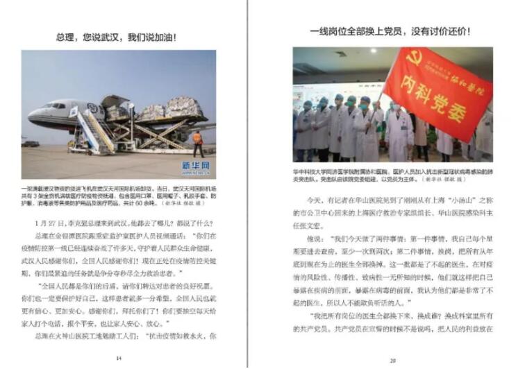 《2020:中國戰(zhàn)“疫”日志》一書以日志的形式,記錄了2020年1月23日到2月23日期間,中國每一天的戰(zhàn)“疫”故事:廣大醫(yī)護(hù)人員沒有遲疑、沒有退卻,和死神賽跑,與病毒抗?fàn)帲瑸樯恿?;?jiān)持工作的人民警察、外賣員、環(huán)衛(wèi)工人、快遞員、志愿者……穿梭在城市的每個(gè)角落,守護(hù)著自己的城市;許多媒體記者冒著被感染的風(fēng)險(xiǎn),深入一線采訪報(bào)道……