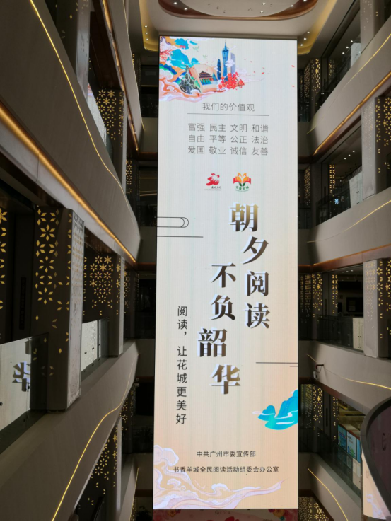 2020廣州讀書月以“朝夕閱讀不負韶華”為主題,廣州塔、花城廣場、北京路、流花展貿中心、廣州圖書館、廣州購書中心、廣州各大新華書店、廣州地鐵、廣州報刊亭等場所,紛紛以亮燈或張貼主題海報的形式,營造濃厚的閱讀氛圍,讓閱讀力量無處不在、溫暖人心、提振信心。