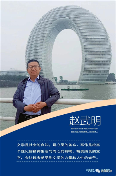 懷瑾握瑜,勤耕不輟。趙武明的寫作是安靜的,由于從事20余年的新聞工作,給他貯存了很多素材,所以他涉獵的寫作范疇很廣,寫散文隨筆、文藝評論、紀(jì)錄片、微電影、大型晚會總撰稿,還研究網(wǎng)絡(luò)文學(xué)。如果說文字是會呼吸的,趙武明的文字除了唯美,更多的是硬骨錚錚,也不乏柔腸的峻厲和倬約,風(fēng)姿獨具,淡雅濃烈,相得益彰,簡約獨立,一語千里,蘊含張力。他常說,寫作要穿透人心抵達(dá)靈魂。向外,不斷追求生命更高的境界;向內(nèi),不斷觸及心靈。