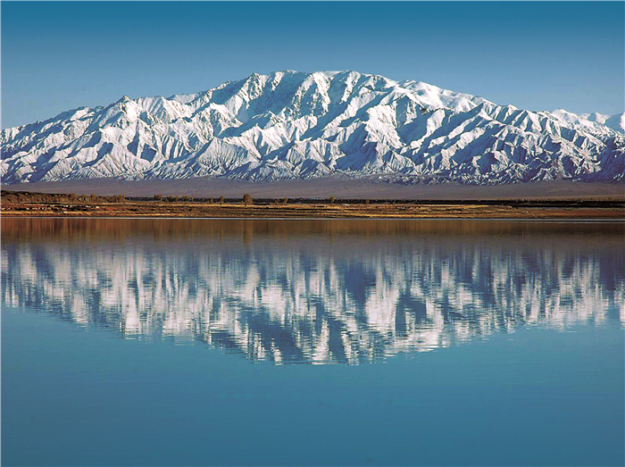 國道蜿蜒山寂靜,渾是冰雪嶺。疊嶂復層巒,瀚海藍天,雙塔妝湖鏡。