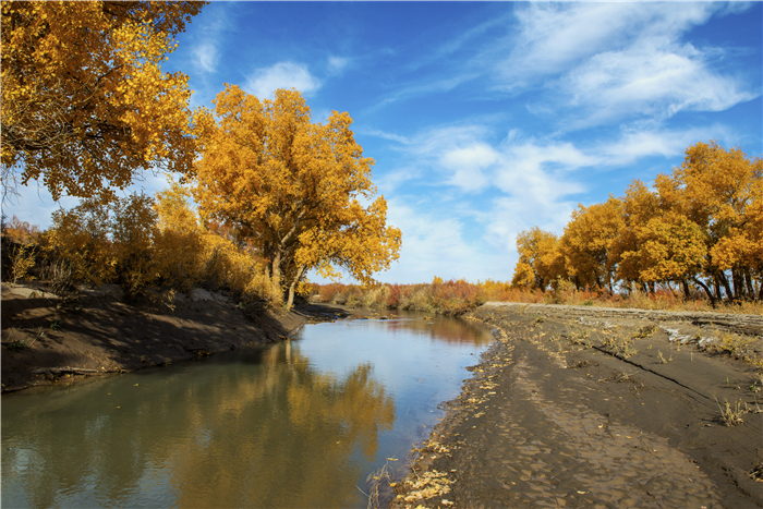 望桿傲立胡楊樹,逾萬年難腐??村\繡金黃,彩袂飄飄,持練當空舞。