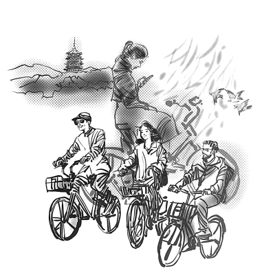 來這里借自行車的人真不少。一位穿著時髦的姑娘,用手機在自行車邊上大約50厘米高的橢圓形鎖墩上一掃,鎖墩發(fā)出“嘀”的一聲響,她便輕巧地拉出鎖在鎖墩上的自行車。然后,她左腳踏在車踏板上,一甩披肩黑發(fā),一抬右腿上車,就輕盈地“飛”走了。我想,這姑娘說不定是學過舞蹈的,要不然不會有這么富有美感的上車騎行動作。
